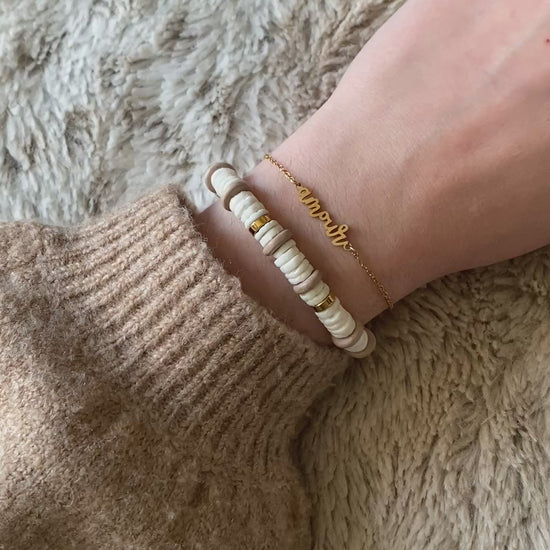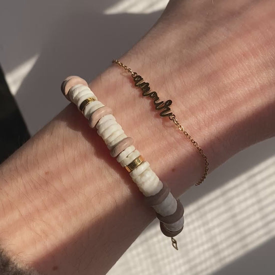 Apporte une touche de naturel et d'élégance à ton style avec ce bracelet en perles heishi, conçu pour sublimer tes tenues en toute saison. Composé de perles en coquillage blanc, en céramique marron et en laiton doré, ce bijou marie délicatesse et sophistication. Ses teintes naturelles et élégantes en font un accessoire adapté à toutes les saisons et à tous les styles. Ce bracelet, à la fois discret et chic, sera ton allié pour rehausser tes tenues avec charme et simplicité. Un incontournable pour celles et ceux qui recherchent une beauté intemporelle.